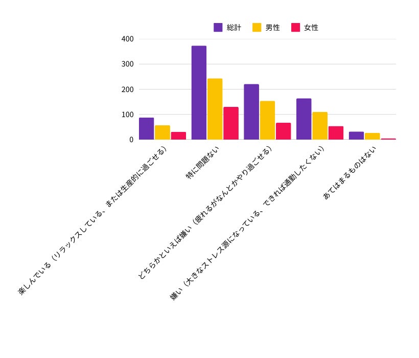 42.48%の回答者が通勤・通学について中立的な意見をもち、25.17%が「どちらかといえば嫌い」と答えました。一方で、18.68%の回答者は通勤を大きなストレス源と見ているようです。
