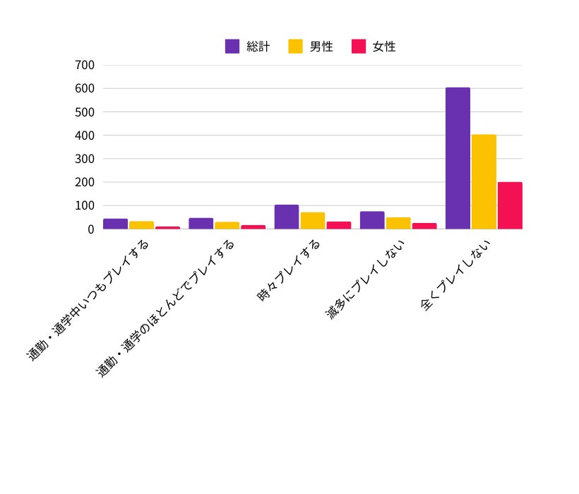 都市部の通勤・通学環境では、混雑やスペースの制約がゲームプレイの障害となることが多いと考えられます。車内でスマホゲームをする人の間では、移動中の隙間時間を活用するために短時間で完結できるスマホゲームが好まれていると考えられます。一部の通勤・通学者の間で、効率的でリラックスできる娯楽としてスマホゲームが人気を得ているようです。