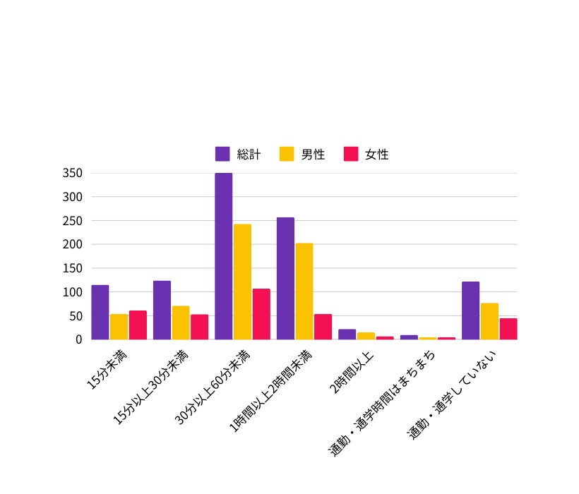 大多数(35%)の回答者が通勤・通学時間を「30分以上60分未満」と答え、次いで25.7%が「1時間以上2時間未満」と回答しました。2時間を超える通勤・通学時間の回答者はわずか2.2%でした。