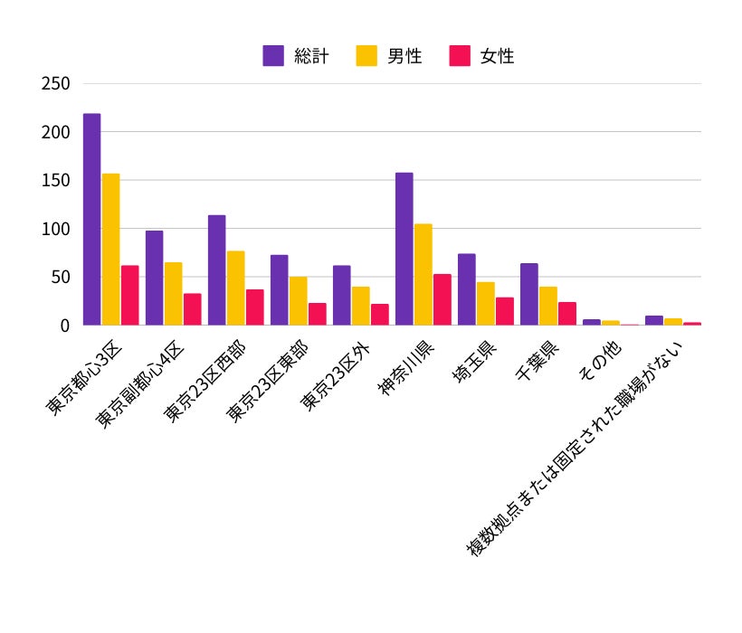 24.94%の回答者が東京都心3区(千代田区、中央区、港区)へ通勤・通学しており、このエリアが雇用や学問の中心であることを示しています。次いで、神奈川県や東京23区西部(品川区、目黒区、大田区、世田谷区、中野区、杉並区、練馬区、板橋区、北区)が挙げられました。