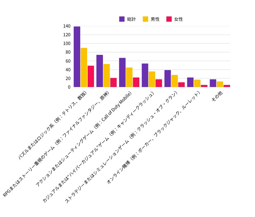 スマホゲーム利用者の間で、「パズルまたはロジック系のゲーム」(50.92%)が最も人気があり、次いで「RPGまたはストーリー重視のゲーム」(27.11%)と「アクションまたはシューティングゲーム」(24.54%)が続きました。一部の回答者は通勤・通学中にオンラインカジノゲームをプレイしており、このグループ内で多様なゲームの嗜好が見られました。