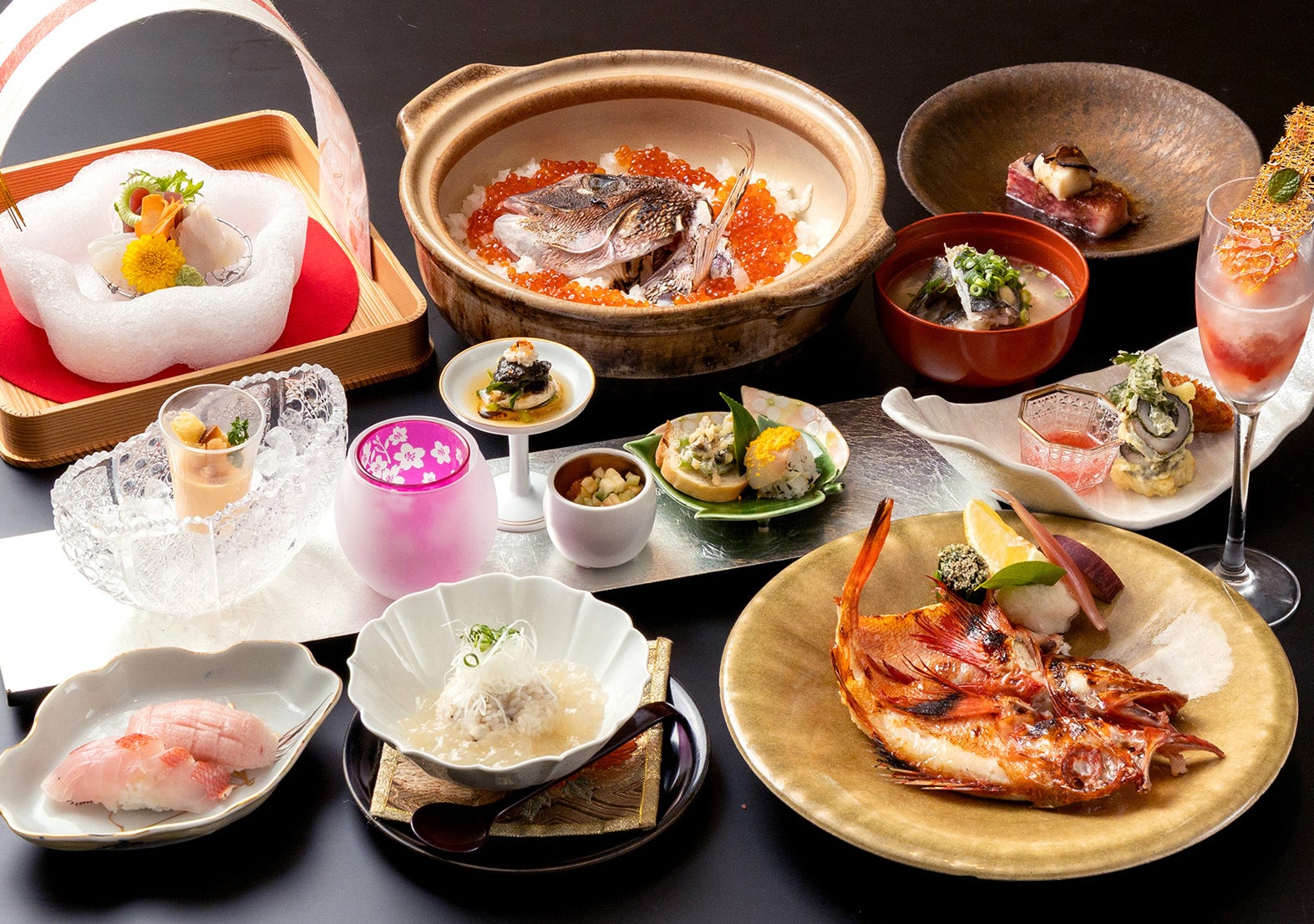 前菜:ホタルイカとうるいの酢味噌和え、ツナと小松菜の煮浸しなど5品/お造り:地魚三点盛り/揚物:椎茸裏白と春野菜/煮物:飛龍頭と春野菜の焚き合わせ/焼物:キンキの幽庵焼き/強肴:山形牛ヒレの一口ステーキ/寿司:大トロとノドグロの握り/食事:桜鯛とイクラの土鍋ご飯/デザート:苺シャーベット自家製ジンジャー ※季節により内容が変わります。