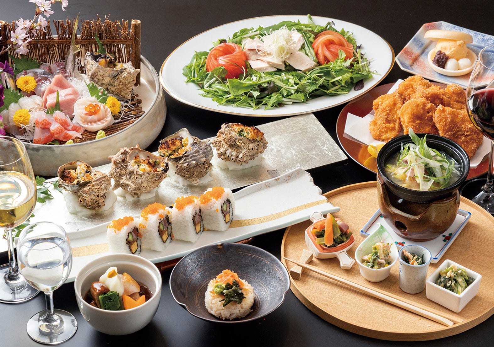 前菜:春キャベツと桜美豚のみぞれ煮/お造り:地魚盛り合わせ/揚物:フグの柿の種/煮物:豚の角煮/焼物:サザエの香草バター焼き/サラダ:蒸し鶏のサラダ/寿司:裏巻き/食事:焼きおにぎり茶漬け/デザート:白玉バニラ ※季節により内容が変わります。