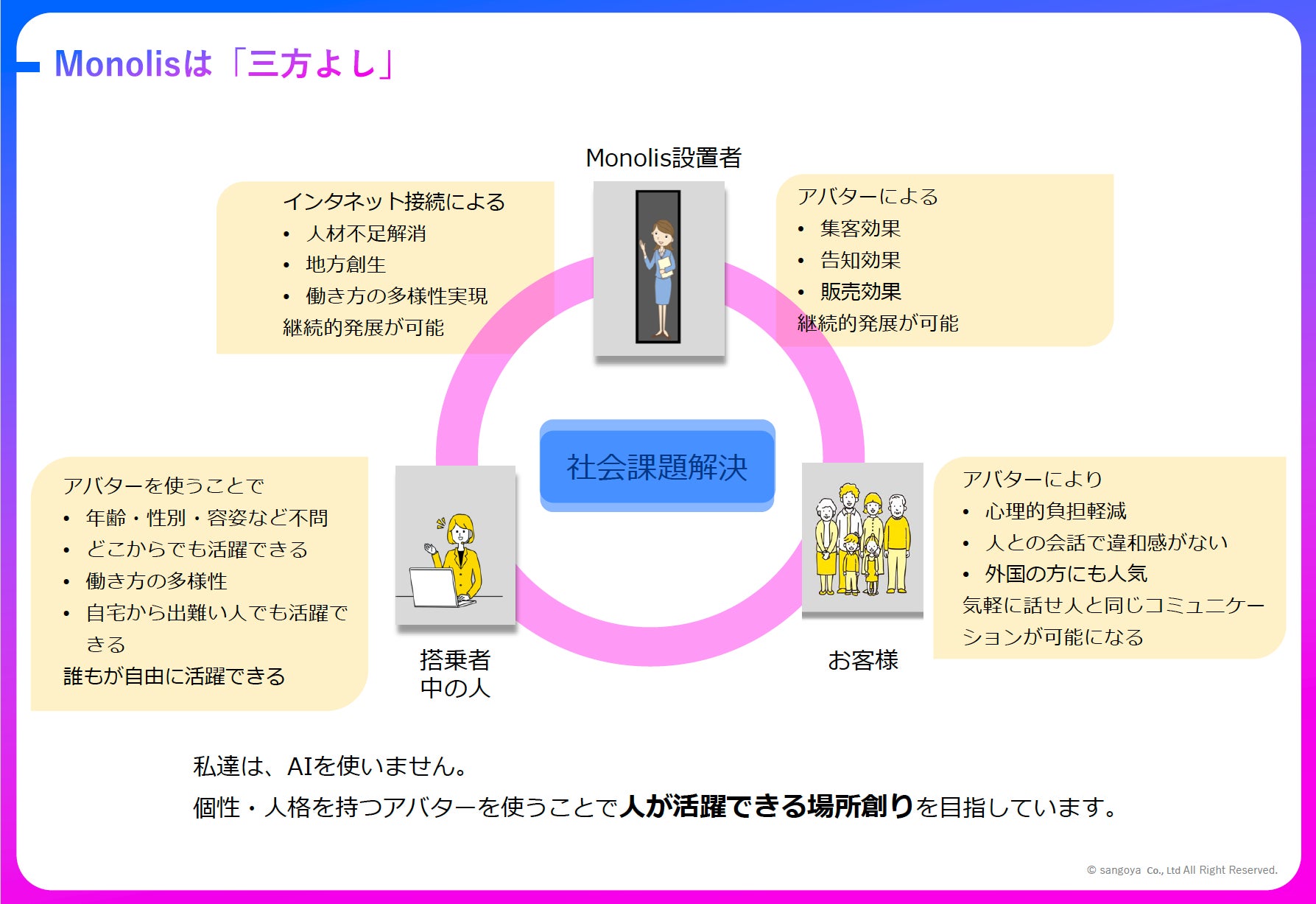 私たちはAIを使いません。個性・人格を持つアバターを使うことで人が活躍できる場所創りを目指しています。