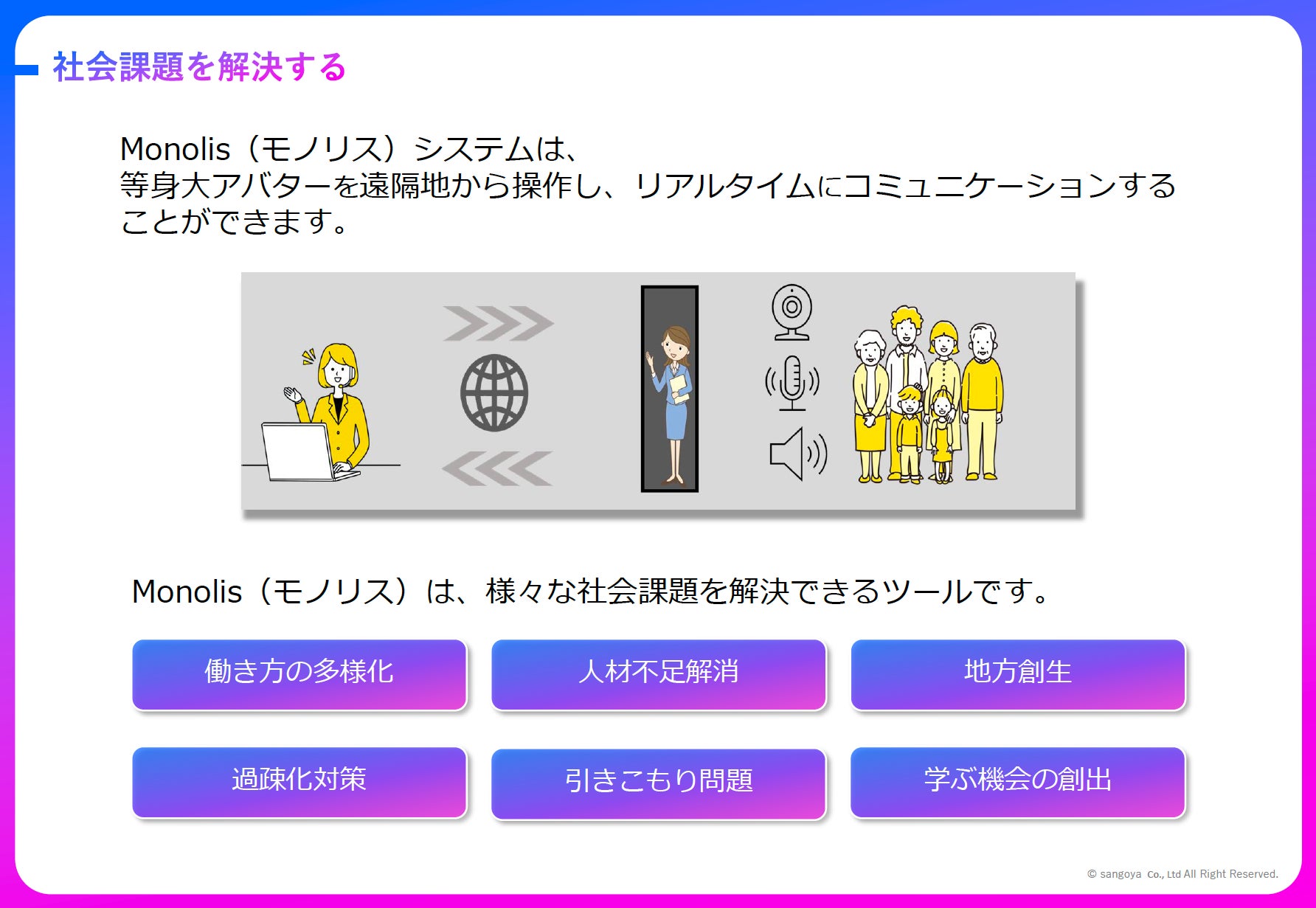 また、バーチャルアバターロボットを導入する企業などにとっても企業イメージの向上・人材不足の改善・働き方改革へと繋がります。少子高齢化による人材不足解消や働き方改革、地方創生など場所と時間を超越することができるMonolisなら解決可能です。