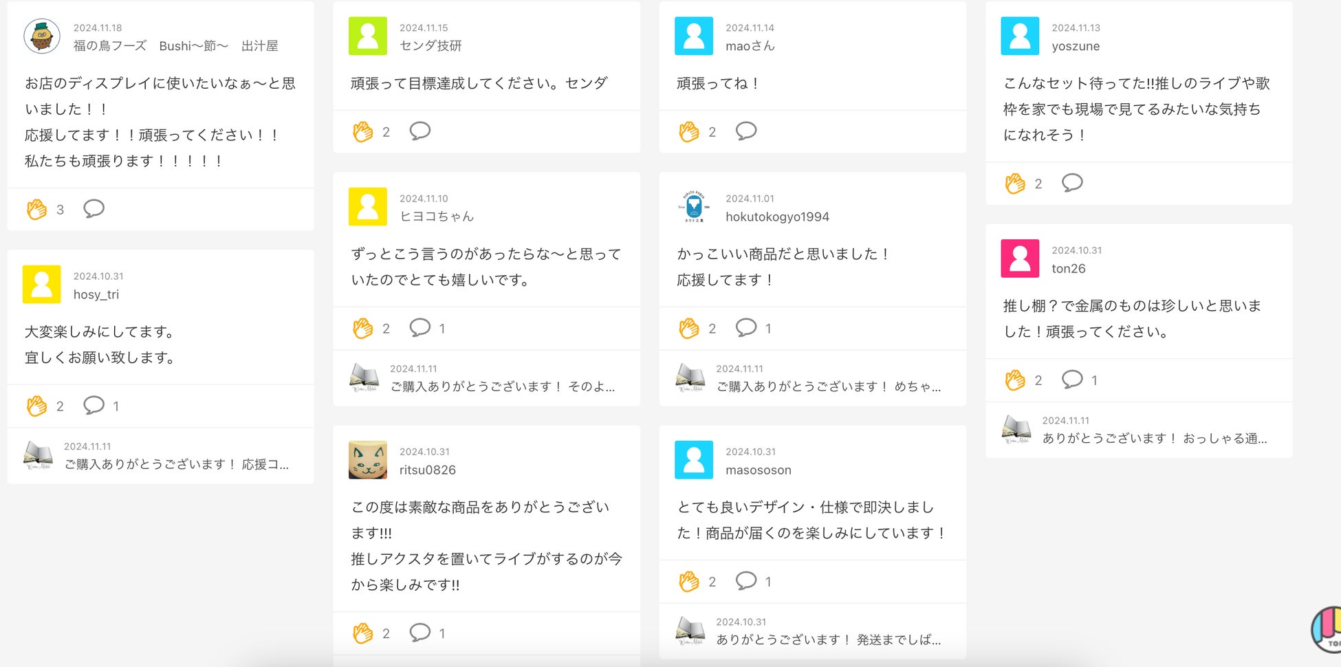 こうした温かいメッセージに支えられ、目標を達成できたことを心より感謝申し上げます。これからも皆さまと一緒に、新しい推し活の楽しみ方を広げてまいります。