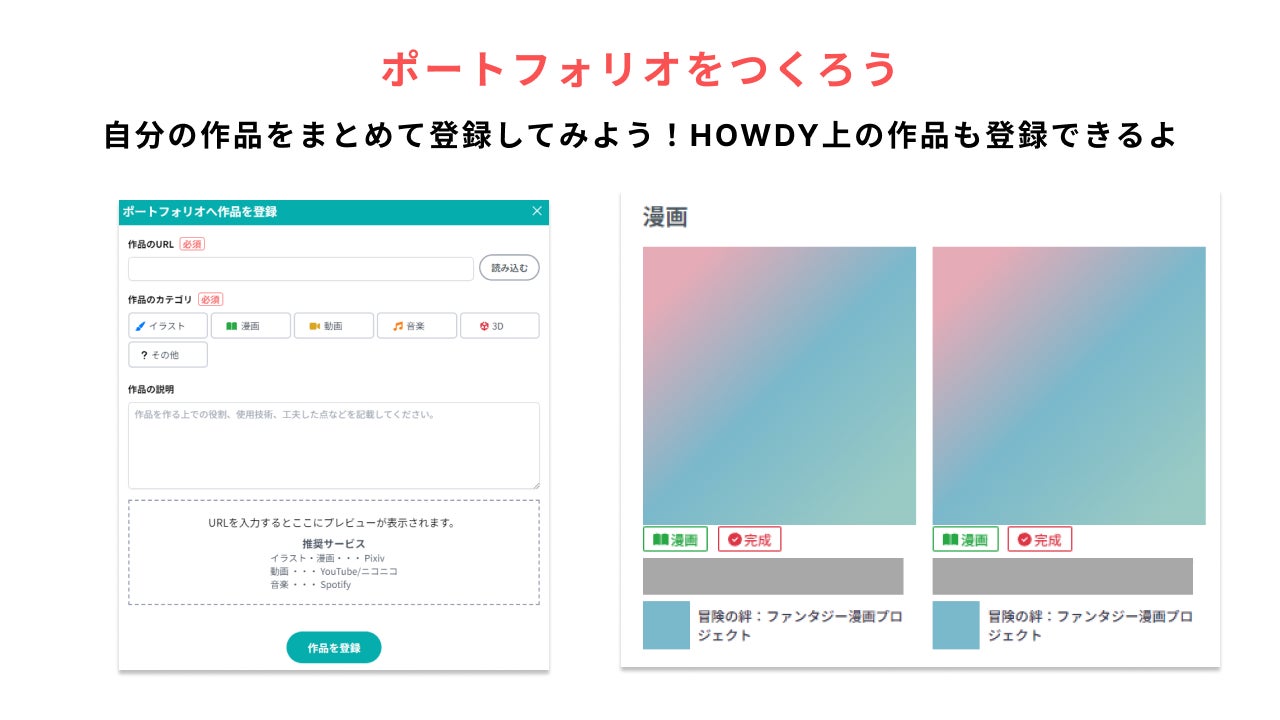 過去に制作した作品など、各種プラットフォーム上に散らばる作品をHOWDYアカウントに紐づけ、ポートフォリオツールとして使用できます。