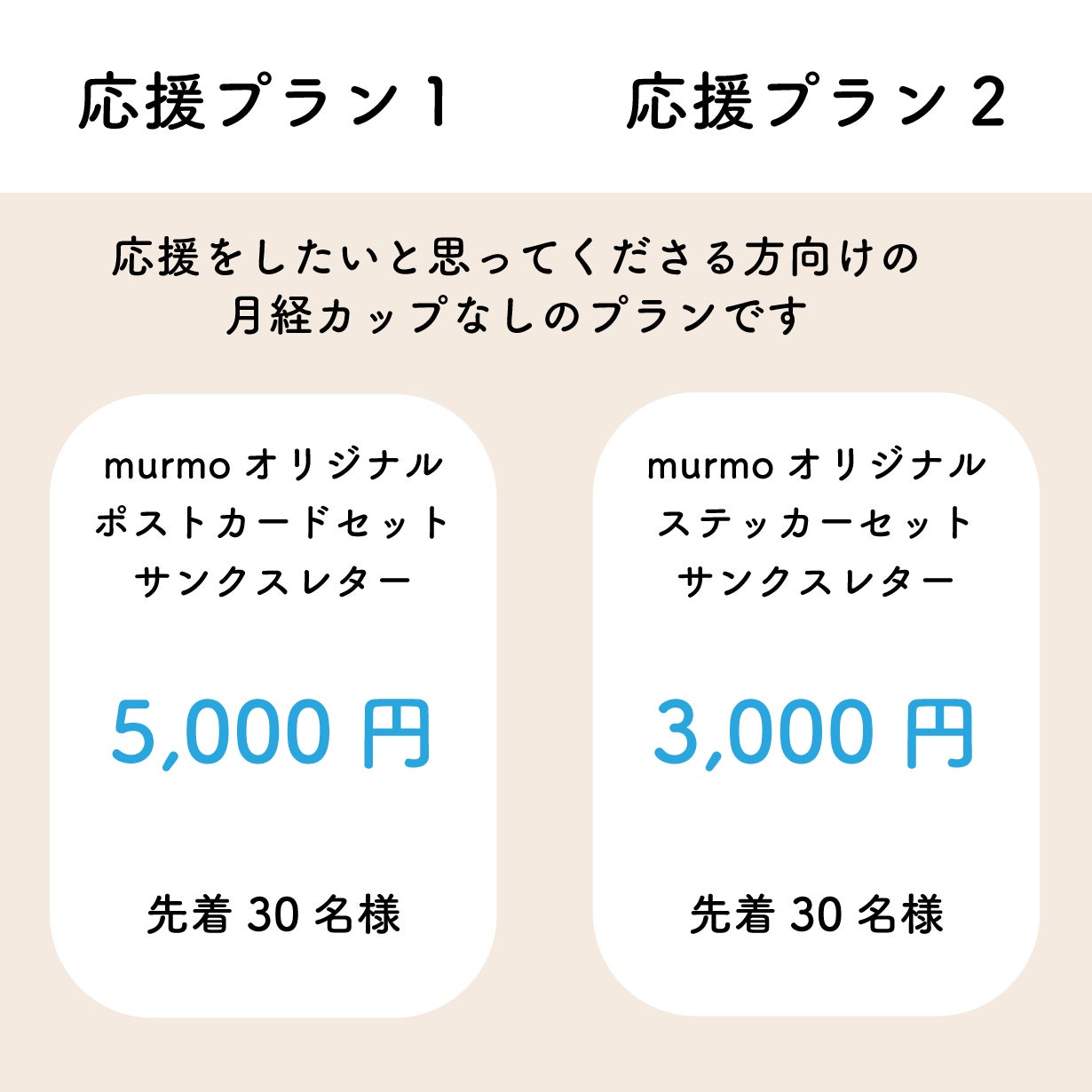 また、murmoのことを応援したいけれど、男性や閉経を迎えられた方など月経カップは不要な方に向けた応援プランもご用意いたしました。ぜひこの機会にmurmoのことを知っていただき、応援くださいますと幸いです。