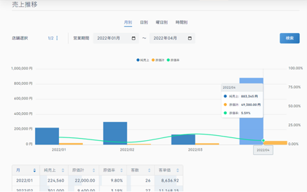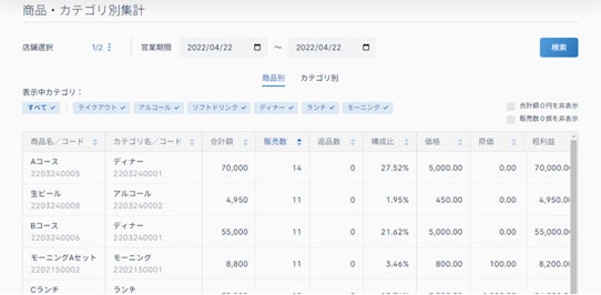 カテゴリ別・商品別の売上情報に加え、日別・曜日別・時間帯別の販売動向をクラウド上(ブラウザ)で確認できます。また、締め情報の確認にも対応しており、外部のクラウド売上管理システム(ぴかいちナビ、ASPIT、freeeなど)との連携も可能です。