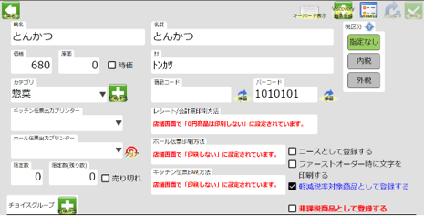 テイクアウト商品については、「軽減税率対象商品」にチェックを入れて登録します。