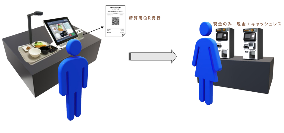 読み取りエリアと会計エリアを分離することで、ピーク時の混雑を緩和。現金専用機とキャッシュレス対応機の2台構成を推奨しています。