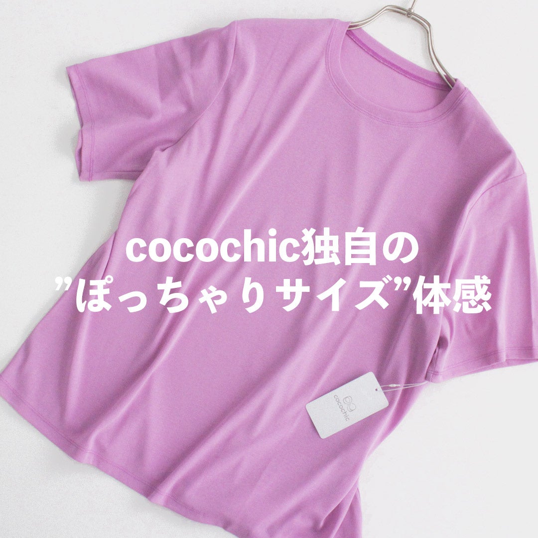 “ぽっちゃり”だからと大きいサイズを選ぶと、肩が落ちたり着丈や袖丈が長すぎたり、だぼんとしてかえって大きく見えることがあります。cocochicは、身長158cmを基準に、カラダのぽっちゃり部分にだけゆとりを持たせ、動きやすいながらもスッキリ見えする独自サイズを展開しています。