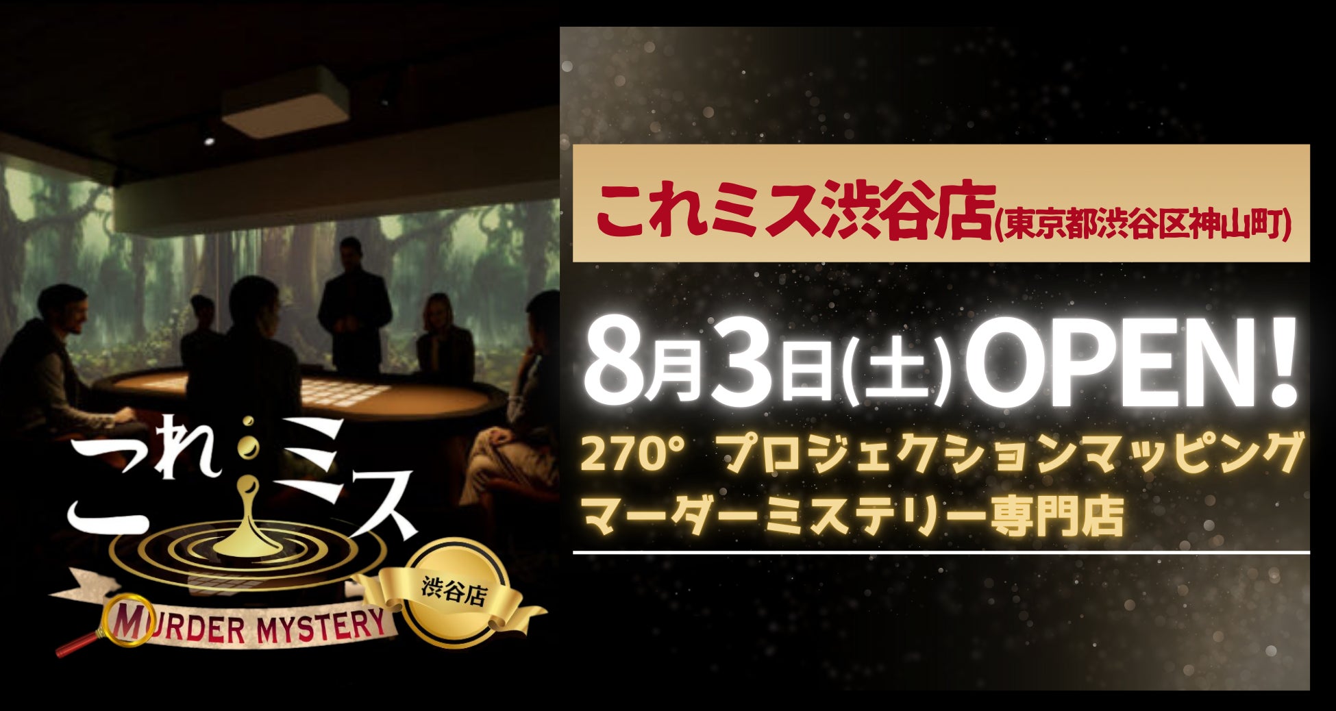 マーダーミステリーの事業を展開する株式会社これからミステリー(本社:東京都渋谷区、代表取締役:飯田祐基、以下これからミステリー)は、マーダーミステリー専門店として中野店に続いて2店舗目となる「これミス渋谷本店」を2024年8月3日にオープンいたします。
