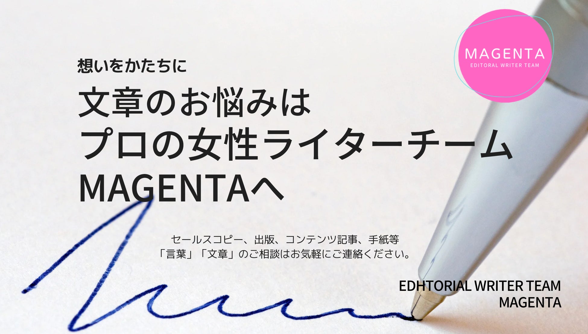 以後、1年の活動を通し、インタビューのみで顧客の主を原稿化できるライターの存在が、出版代行のみのサービスとの差別化を図る上でも大きいことを確認し、今後さらに優秀なライター陣の確保、マネジメントを行うため、“Magenta”を運営母体である和ごころ株式会社から正式に事業譲受しました。一方、和ごころ株式会社としても、ライターに対して業務の安定供給が図れる上、新規のライター募集、育成にメリットが大きいと判断、当社のライター部門統括マネジメントの立場を以って事業譲渡に至りました。
