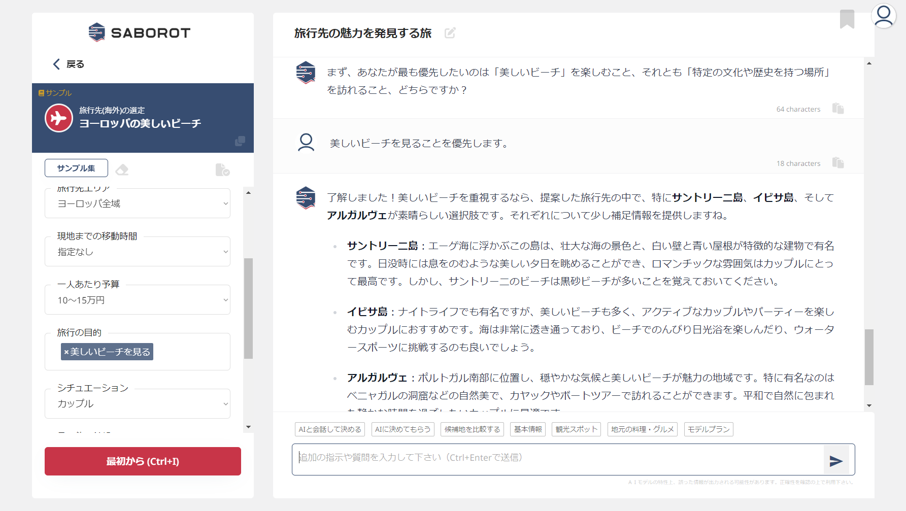 SABOROT(所在地:東京都渋谷区)は、GPT-4(ChatGPTの言語エンジン)を利用した生成AIサービスを提供しております。このたび、AIとの対話から最適な旅行先を提案するAIボットを追加・拡張しました。この機能は無料プランでもご利用いただけます。