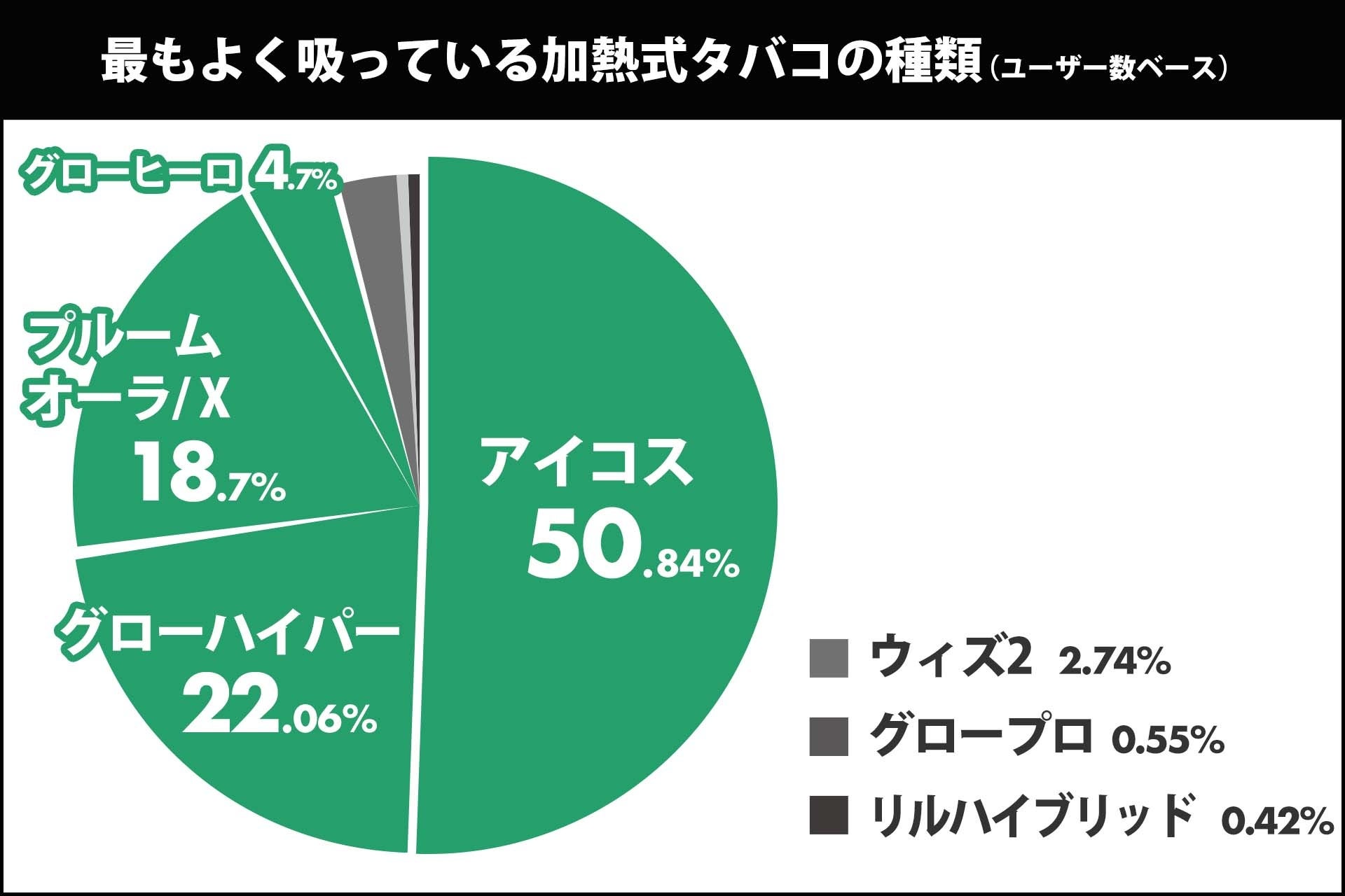 アイコスは、依然として過半数のシェアを誇るものの、他社新型デバイス投入の影響を受け、本調査開始以来、最も低いシェア率となりました。