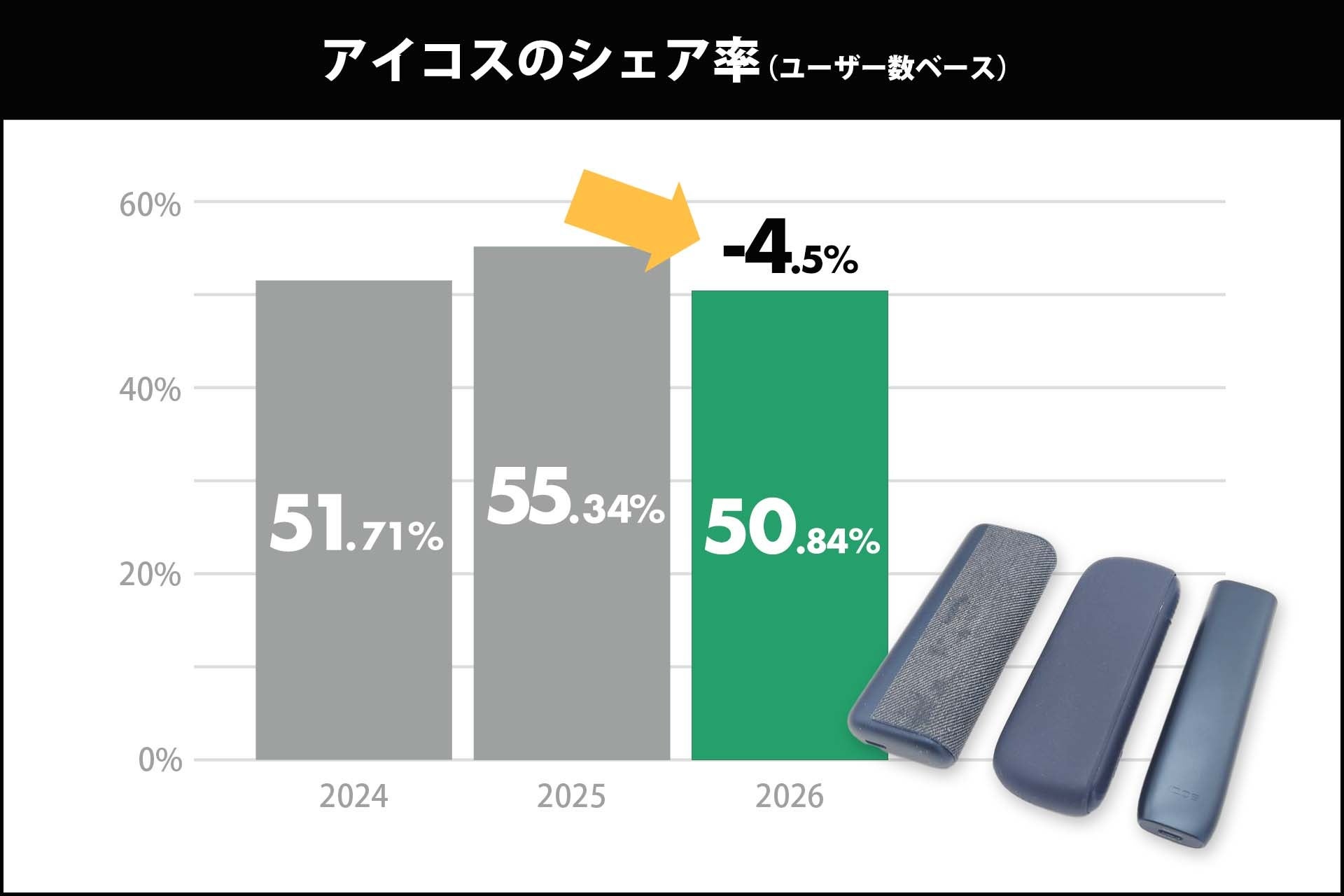 ■IQOS(アイコス):首位維持も、前年比4.54%減の50.84%へ
