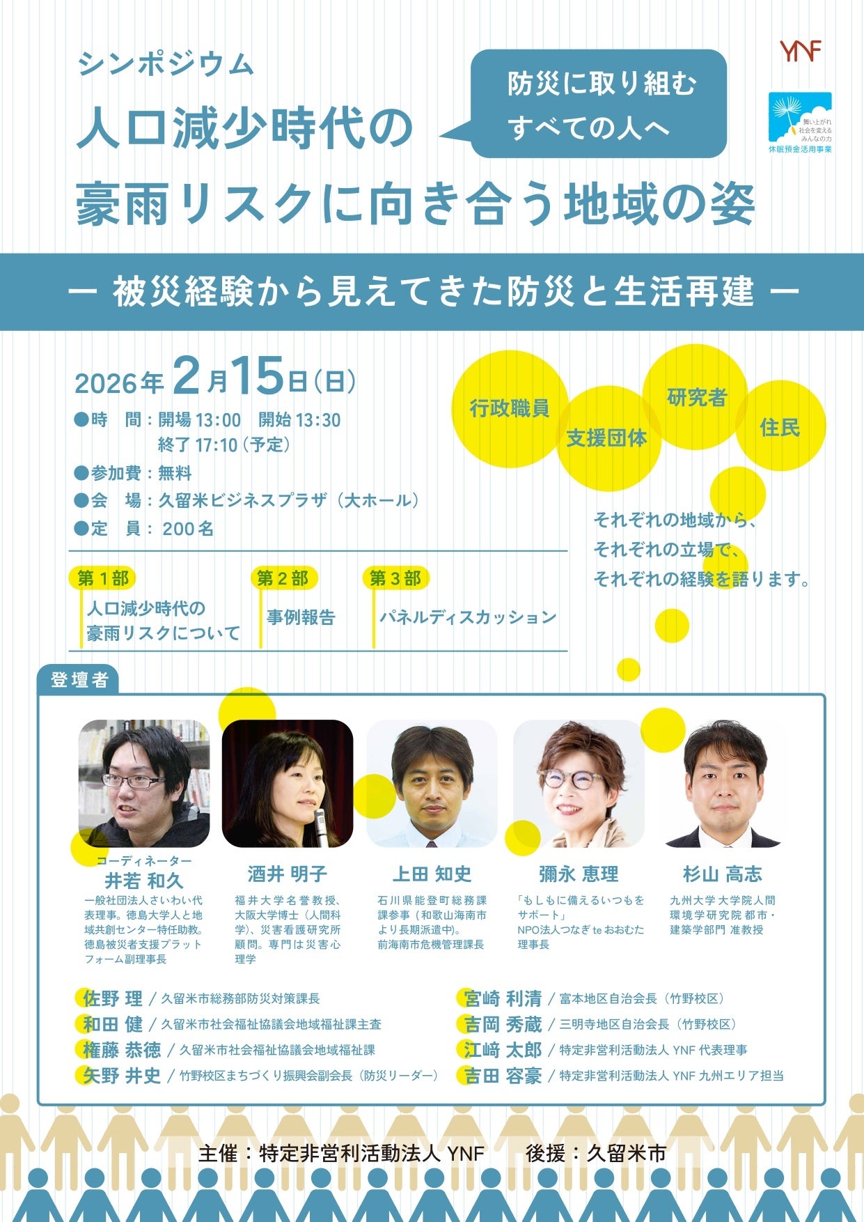 本シンポジウムでは、久留米での取り組みに加え、同様の豪雨リスクや被災経験をもつ他地域の実践を通して、防災と被災後の生活再建をひと続きのものとして捉え、それぞれの地域で見えてきた課題や取り組みを共有します。