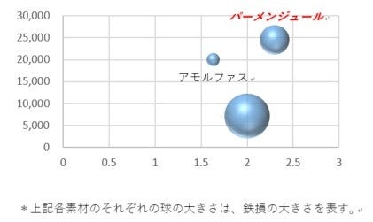 パーメンジュール材は図1に示すように高磁束密度、高透磁率、低鉄損という特性がありますが、特性を実現するために焼鈍工程が必要です。従来は焼鈍後の単板の積層技術がなく、量産不可でしたが、当社は高速型外接着積層技術を開発し、パーメンジュール材を実用化しました。