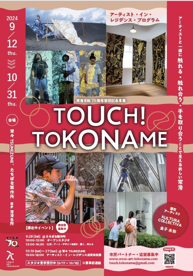 市民団体CROSS ART TOKONAME(所在地:愛知県常滑市奥条、代表:片岡麻美)が実施する常滑市制70周年特別記念事業(中規模事業)アーティスト・イン・レジデンス・プログラム「TOUCH!TOKONAME」の成果発表展が10月19日~27日の間、カフェギャラリー「常々 TSUNEZUNE」で開催されます。アーティストたちは、約2か月間常滑市内に滞在し、子どもたちや地域の作家、市民と交流しながら制作活動を行っています。成果発表展では、アーティストたちが滞在を通して得た新たな視点や創造を市民と広く分かち合います。