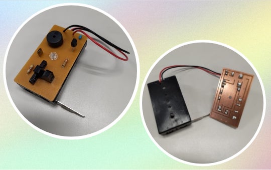 電子工作を通して電気エネルギーが他のエネルギーに変わることを、光を使って確認。メロディーICの信号(音)を光に変えて発信、センサーで受け取り、電気の信号に変えて、スピーカーから音を出します。