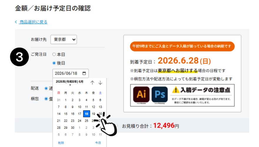「デザイン完成日」や「社内承認日」など、発注までの準備期間を想定して発注日を選択できます。実務の進捗に合わせた納期確認が可能です。