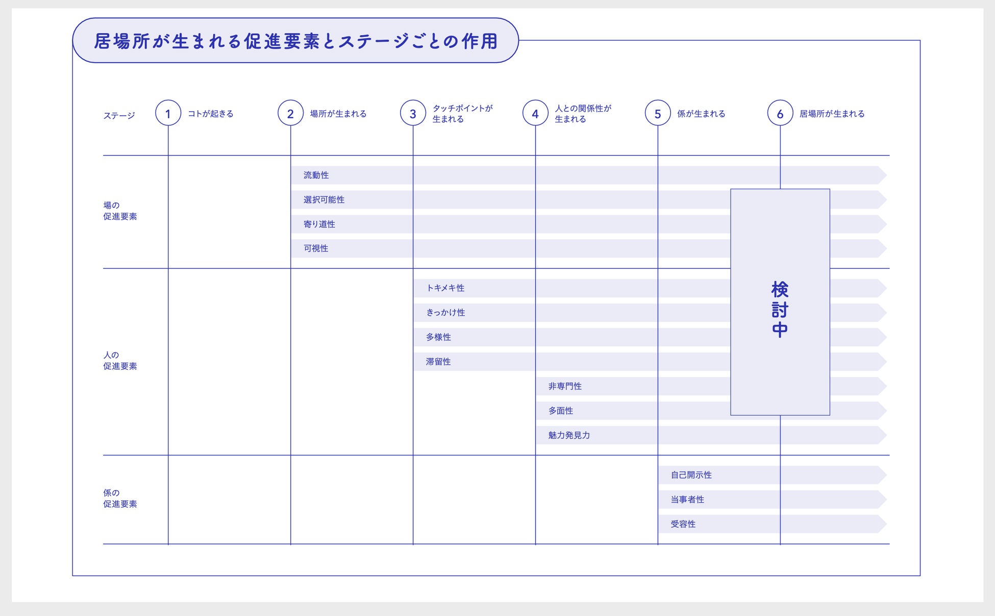 しかし、各回の専門家から得た事例の解剖・分析を進めていくと、当初仮説として考えていた構成要素だけではなく、それを加速させる「促進要素」のようなものがあるのではないかという仮説にたどり着きました。この促進要素は、作用するステージが異なるものの、「人」「場」「係」に付随することで、より「居場所」が生まれやすくなり、より居心地の良い場をつくることができるのではないかと考えています。