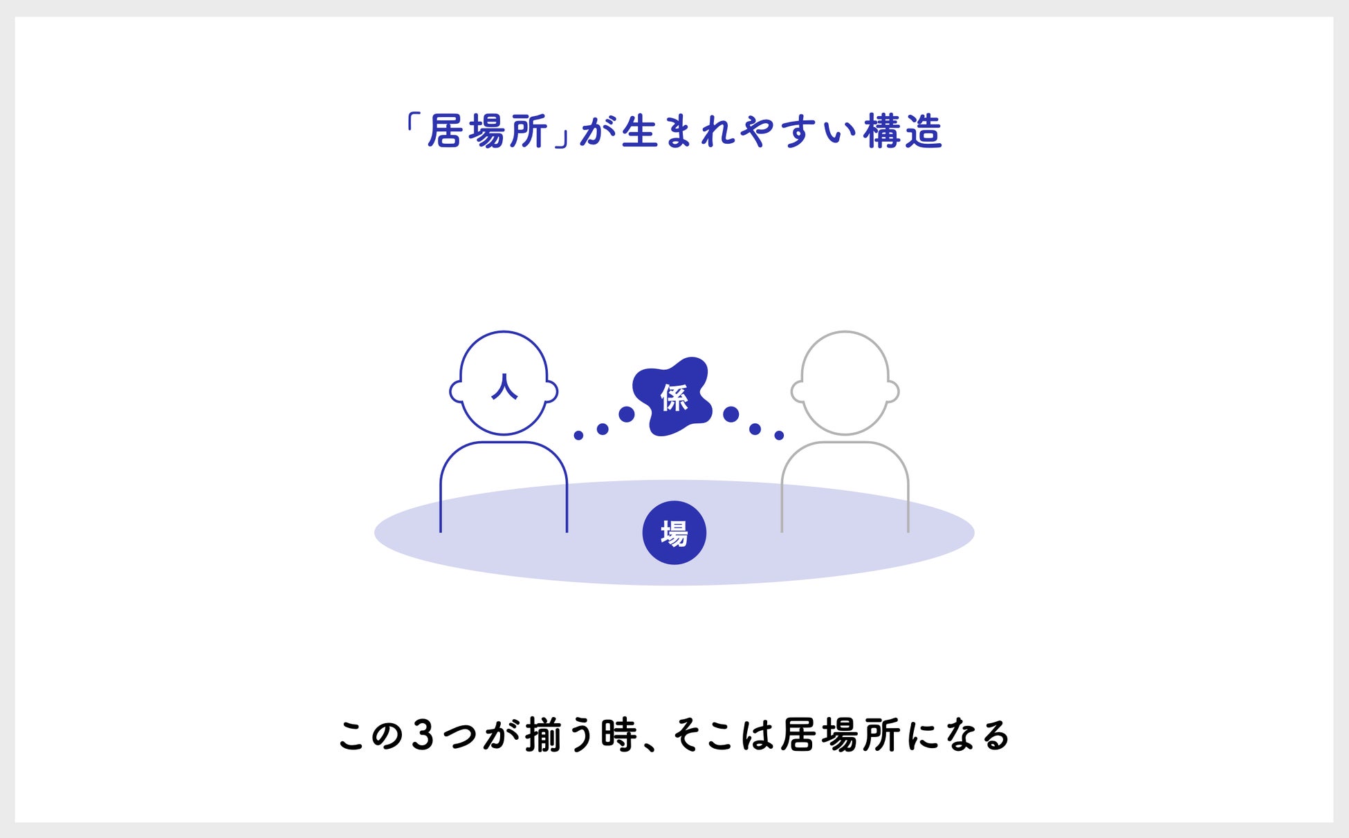 この前提に基づき、私たちは「居場所」は単なる物理的な場や関係性だけではなく、居場所が成立するためには「人」「場」「係」がという構成要素があるのではないかという仮説を立て、解剖を実施してきました。「人」は、そこにいる人や場を開いている人、「場」は、身を置ける様々な空間、「係」は、自認できる存在意義を指しています。
