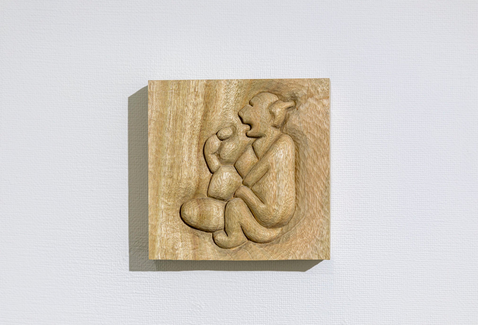 季節の菓子やおまんじゅうを提供する和菓子店HIGASHIYA man 丸の内には、線と余白を主題に制作する彫刻家、高山瑞の木彫作品を展示します。