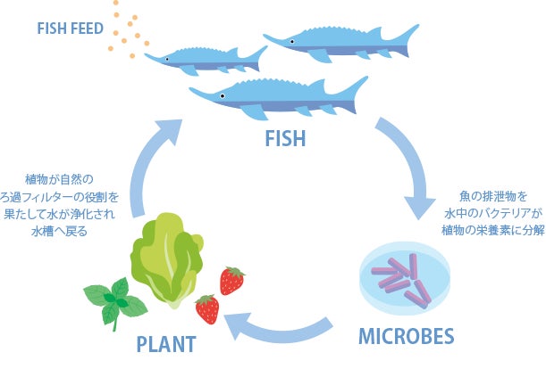 アクアポニックスは、養殖と水耕栽培を同時に行う循環型農法です。システムの仕組みとしては、養殖している魚から出る排泄物を水中でバクテリアに分解させることで堆肥へと変え、それを肥料として水耕栽培へ送ることで植物を育てます。また、同時に植物に栄養素を吸われた後の水は浄化された状態となり養殖側へ戻すことができるため、水を一切捨てない完全循環型の有機栽培を実現します。実際に当社の長岡プラントでは、稼働から5年経過しますが、これまで一度も水を換えることなく生産を続けることに成功しています。