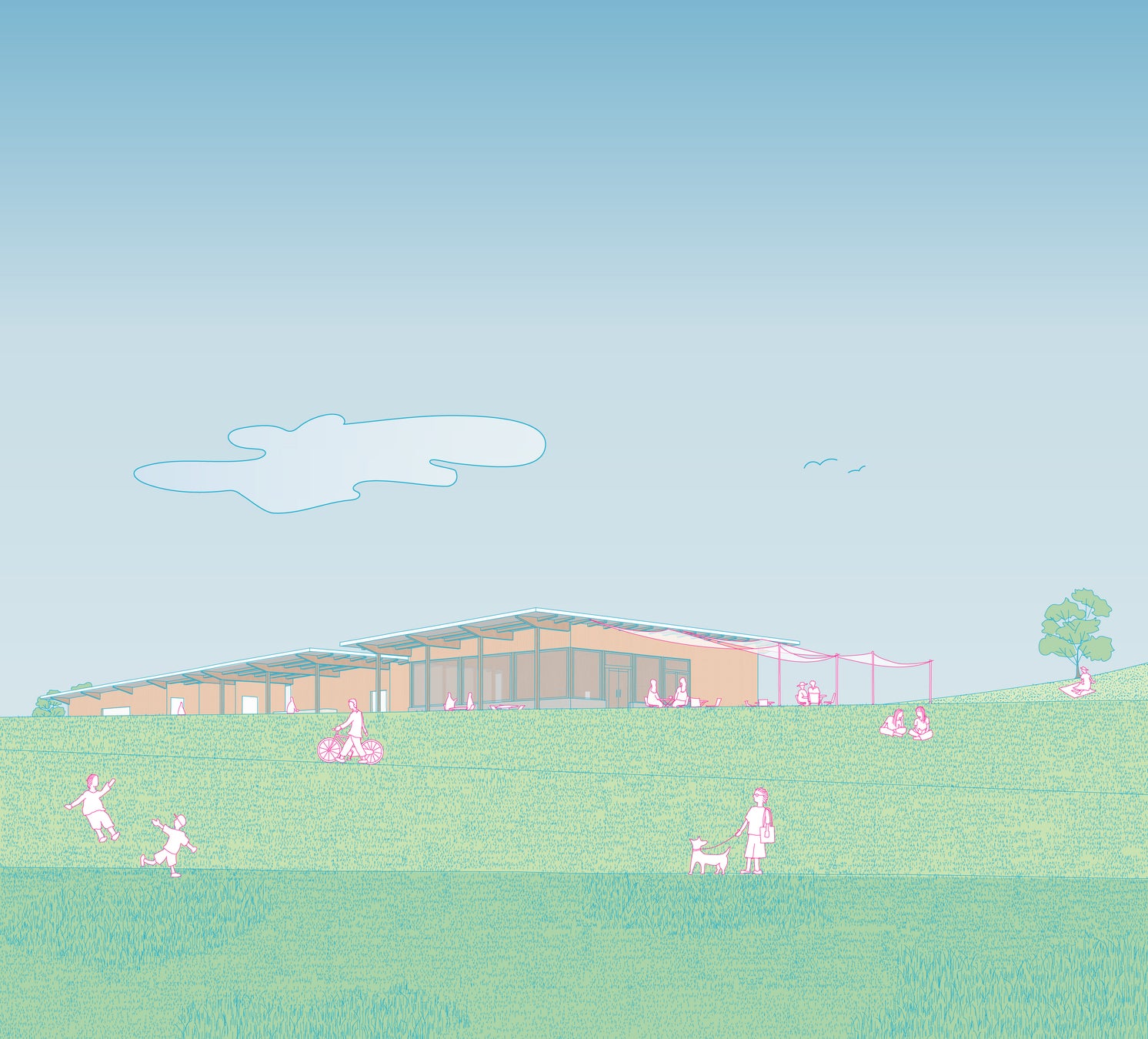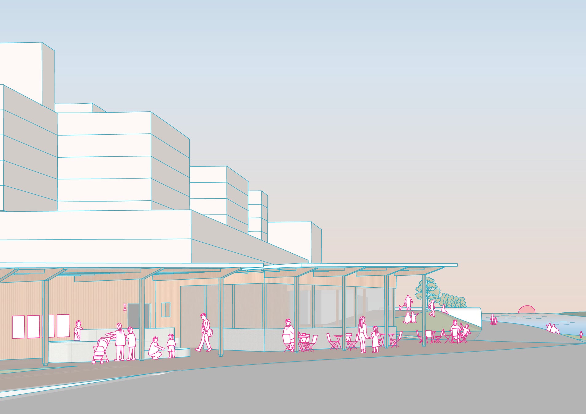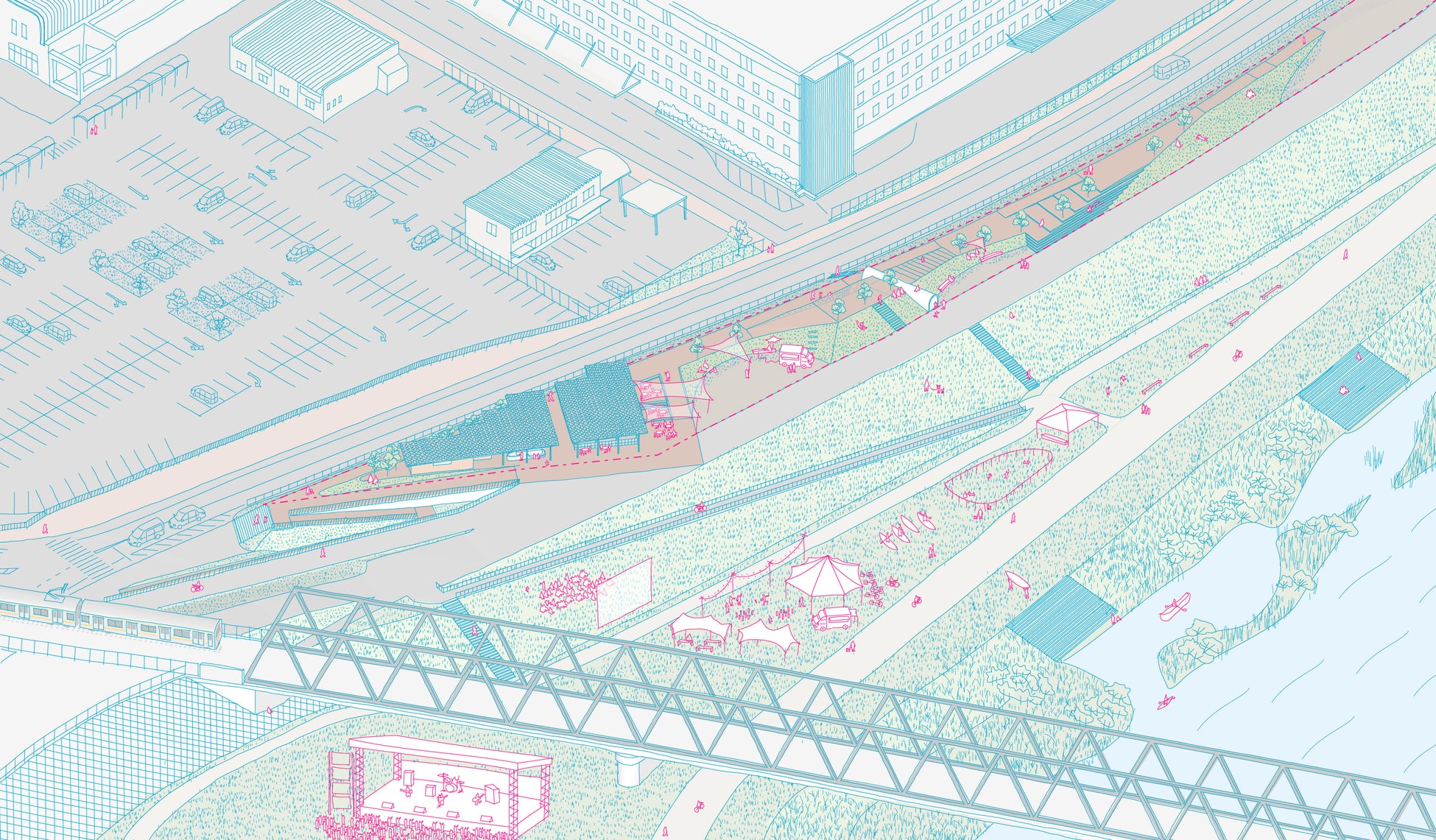 民間ゾーン: リバーサイドカフェ、屋外シャワー、土手広場