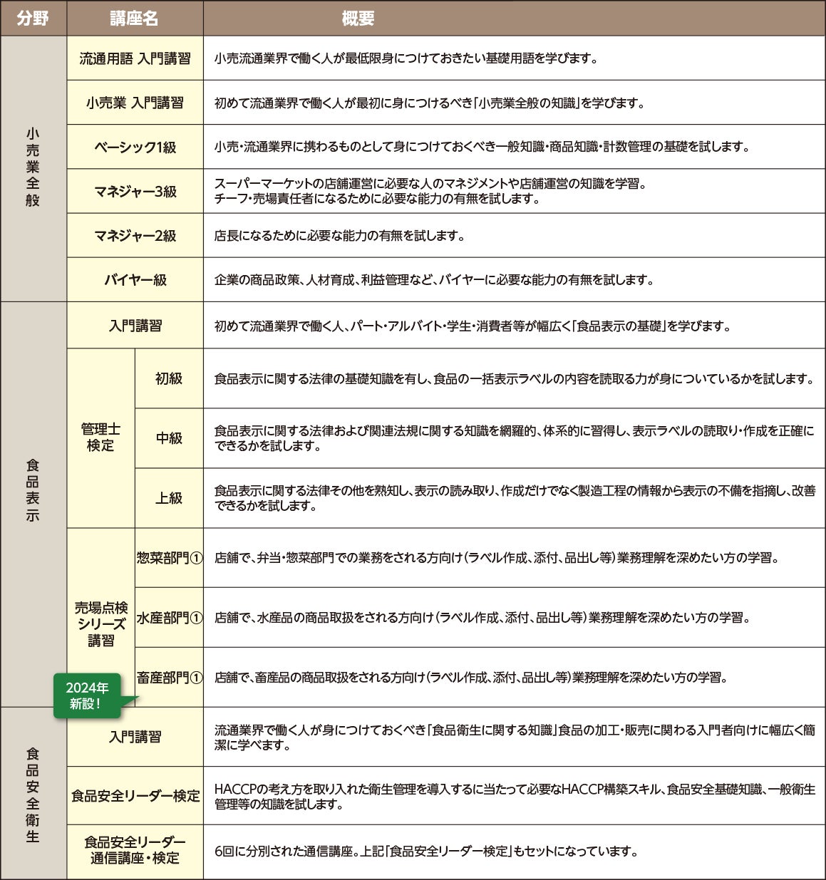 スーパーマーケットをはじめとする小売業や流通業で働く人の知識と技術の向上を目的とした検定試験で、厚生労働省が策定した「職業能力評価基準」*に準拠しており、「小売業全般」「食品表示管理士」「食品安全衛生」の3分野において、キャリア・興味に合わせて受検・受講が可能です。1999年以来、のべ10万人以上の方が受検・受講しています。2024年より、一般消費者、学生をはじめとした個人の受検・受講も可能となり、小売・流通業界の理解、知識の取得とともに、食の安全に関して学ぶ機会として、実生活にも役立てていただきたいと考えています。