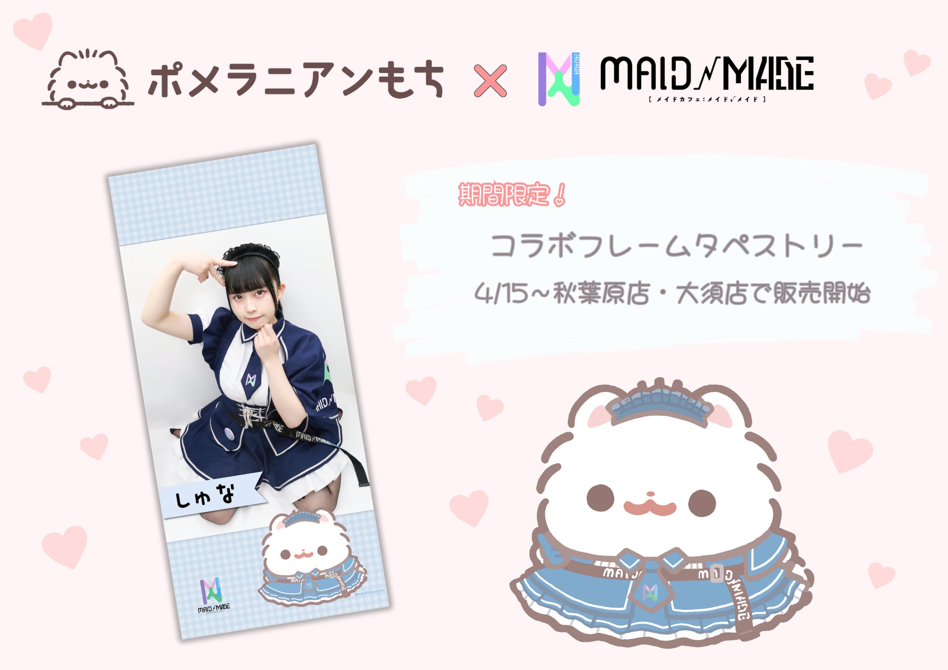 『ポメラニアンもち』とアキバのメイドカフェ『MAID MADE(メイドメイド)』が期間限定コラボ!描きおろしイラスト使用の限定タペストリーフレームが登場