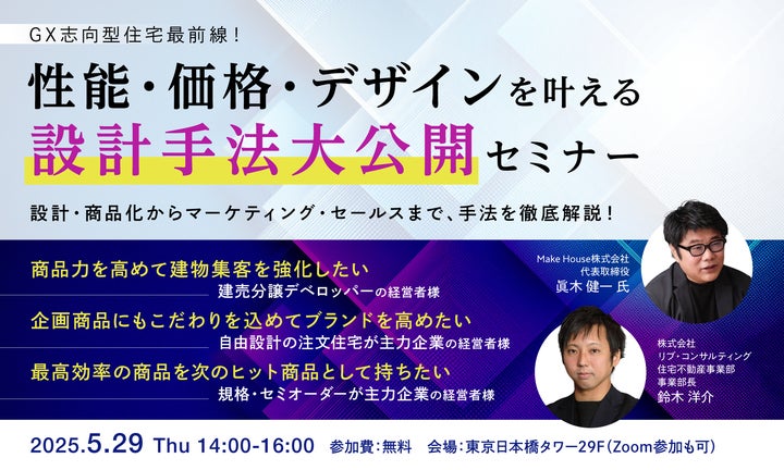 本商品の発売を記念し、5/29(木) 14時より「GX志向型住宅最前線!性能・価格・デザインを叶える設計手法大公開セミナー」を開催いたします。