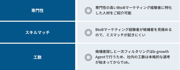 さらに一般の人材エージェントとは異なり、BtoBマーケティング経験者が候補者を見極めることで、ミスマッチのリスクを軽減し、より最適な人材の紹介を実現します。候補者探しと一次フィルタリングは「b-growth Agent」が行うため、企業は本格的な選考に専念でき、選考プロセスの効率化と社内工数の削減が期待できます。