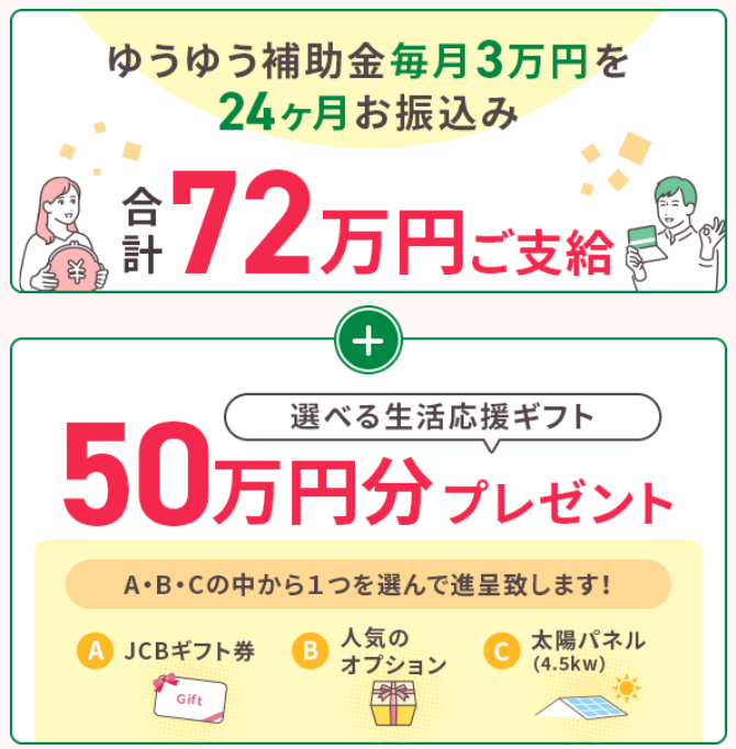 「選べる生活応援ギフト50万円分」としてJCBギフト券、人気オプション、太陽光パネル(4.5kw)無料設置の中からお好きな1点をお選びいただけます。