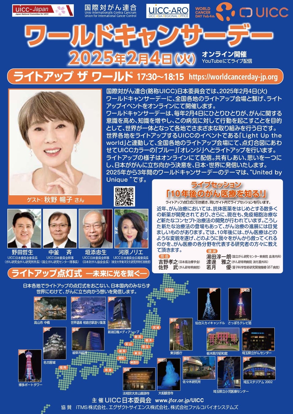 ライトアップ点灯式に引き続き、UICC日本委員会主催によるライブセッション動画を18:45からライブ配信いたします。詳細はワールドキャンサーデー特設サイトにてご確認ください。