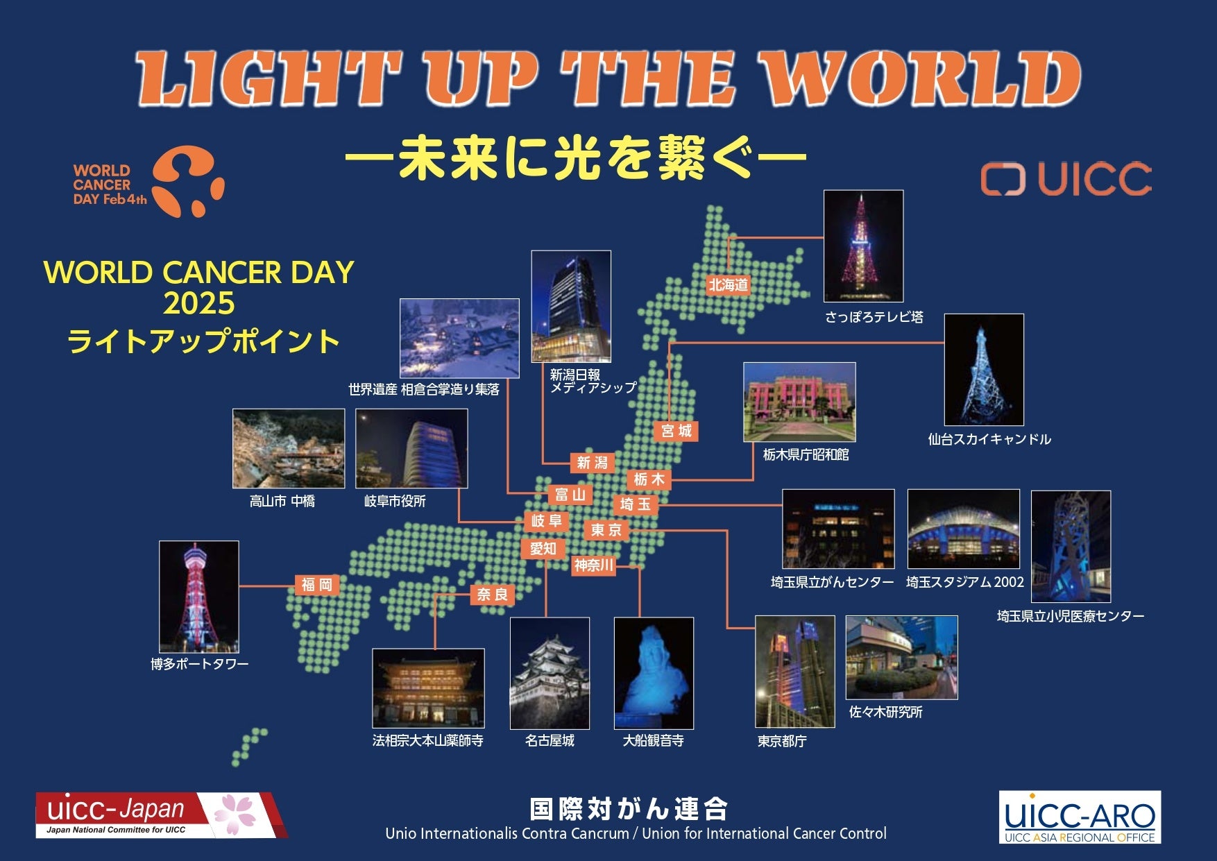 UICCの取り組みの一つである「Light up the world」と連動して、全国各地のライトアップ会場にて、点灯合図にあわせてUICCカラーの「ブルー」「オレンジ」へとライトアップを行います。