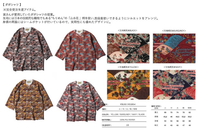今回のコレクションでは、物語の印象的なエピソードや、寅さんといえば!といった象徴的な台詞やモチーフなどをサムライコア独自のグラフィックやマテリアルで再構築し、表現しています。