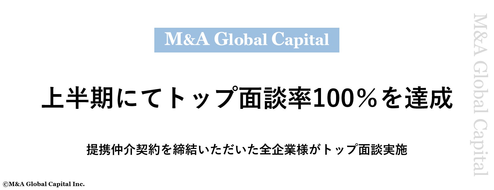 株式会社M&Aグローバルキャピタル(本社:東京都港区、代表取締役:目等 雄大)は、上半期に提携仲介契約を締結した企業のトップ面談実行率が100%を達成したことを発表した。