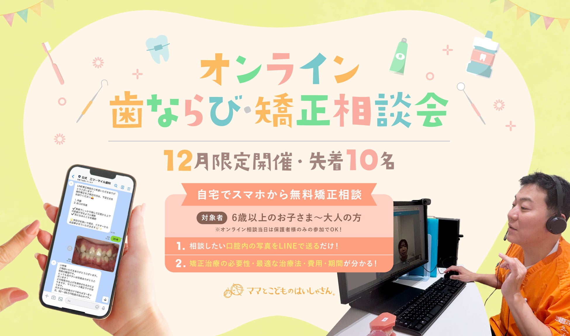 神奈川県横浜市瀬谷区の歯科医院、三ツ境駅前スマイル歯科にて「オンライン歯ならび・矯正相談会」を開催します。対象は6歳以上のお子様から、大人の方になります(横浜市近辺にお住まいの方限定)。