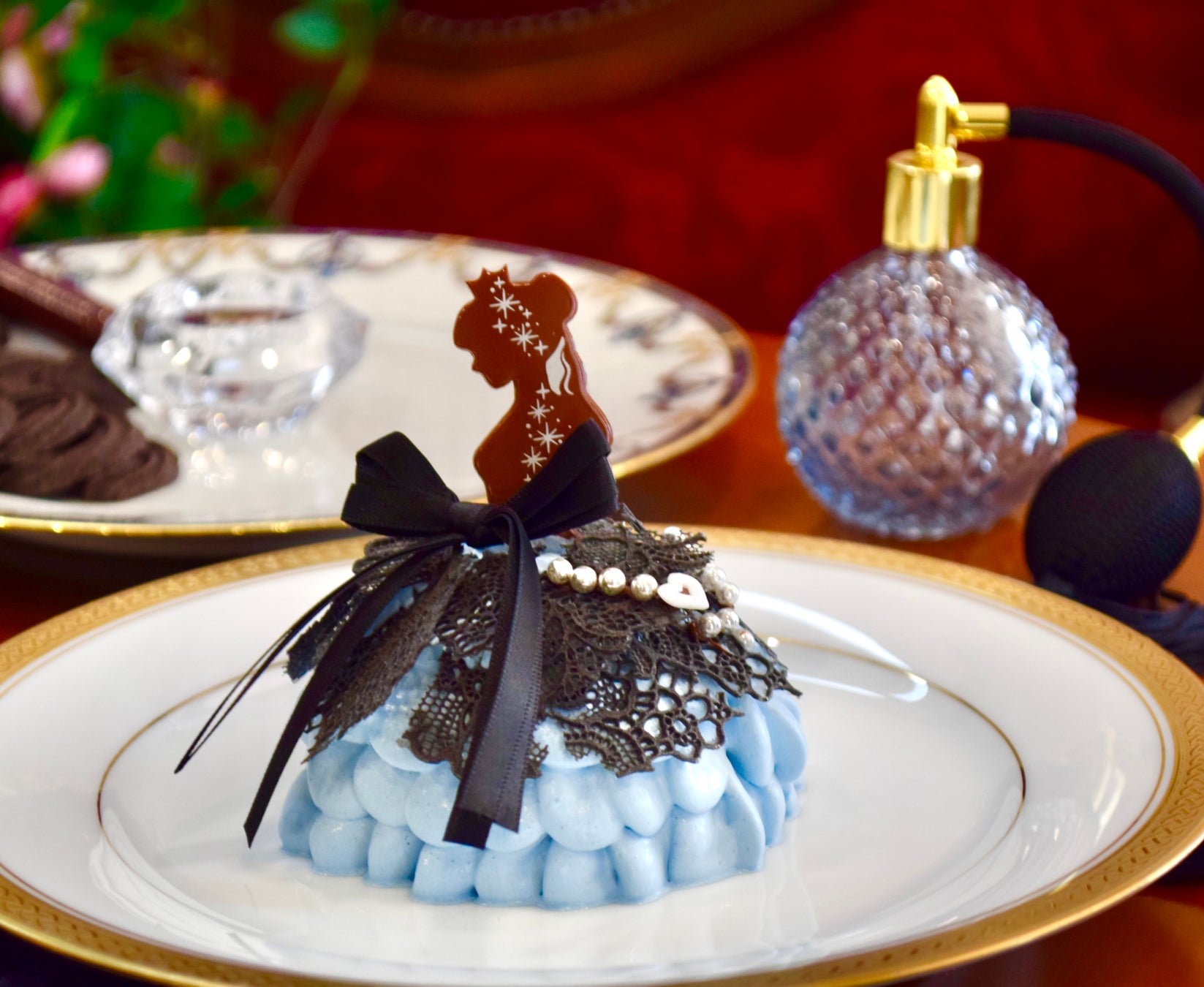 「アートドレスケーキ」は、みかんの皮で香りをつけたほうじ茶クリームが詰まったケーキにブルーのクリームでドレス風にデコレーション。提供時にお好みで香水瓶に入れたオレンジリキュールをひとふき。ドレスの仕上げは提供後にお客様が自由に行う体験型の商品。