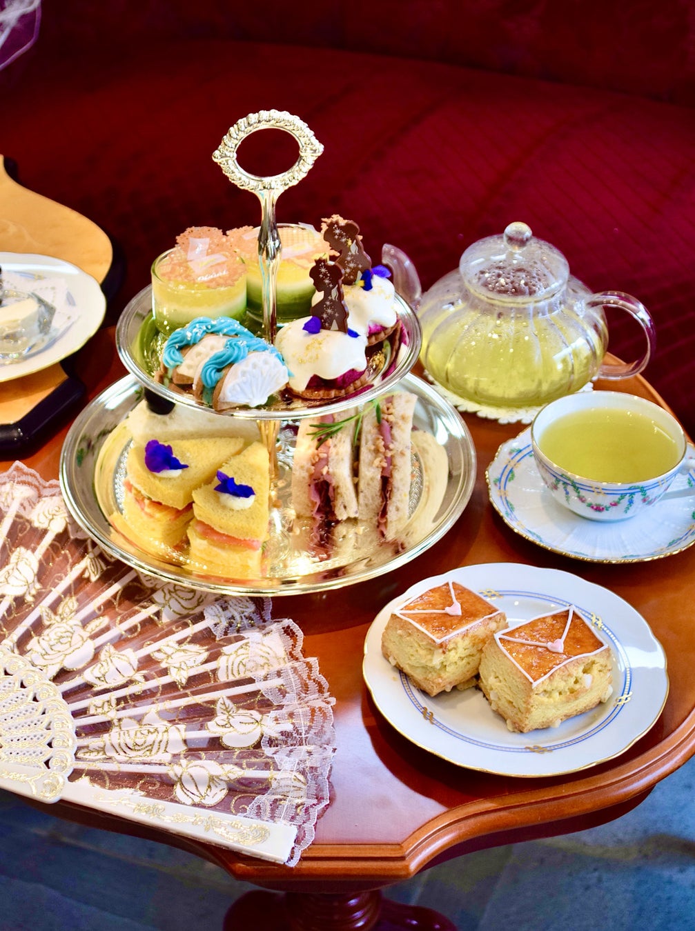 「椿姫」オペラアフタヌーンティーは、物語に連動したティーフードがポイント。オペラ歌手ASAMI氏と協働開発。予約者には椿姫になりきることができるレースの扇子がプレゼントされます。