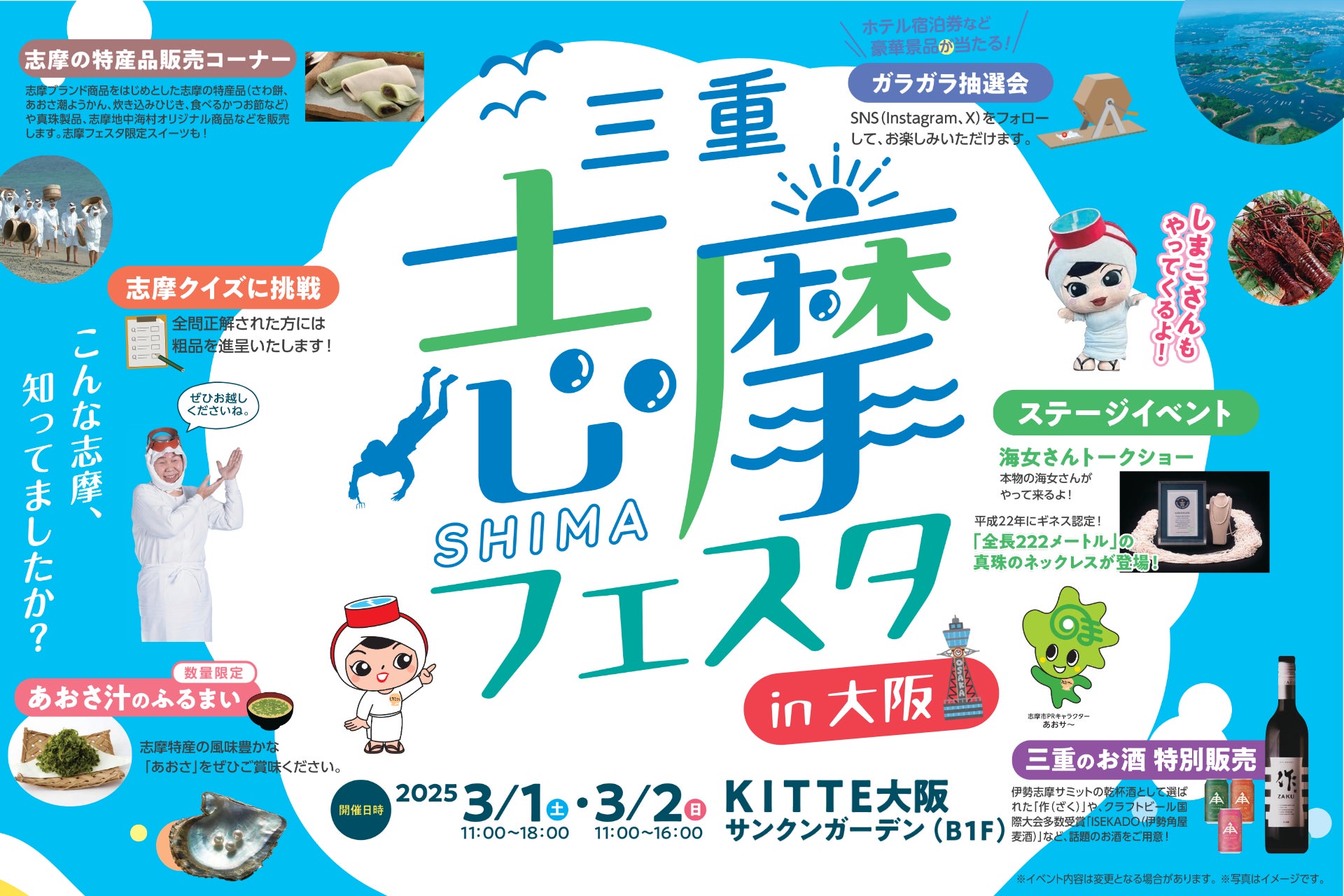 一般社団法人 志摩市観光協会(会長:中村滋)は、2025年3月1日(土)・2日(日)の二日間、KITTE大阪(B1Fサンクンガーデン)にて三重県志摩市観光PRイベント「志摩フェスタ in 大阪」を開催いたします。