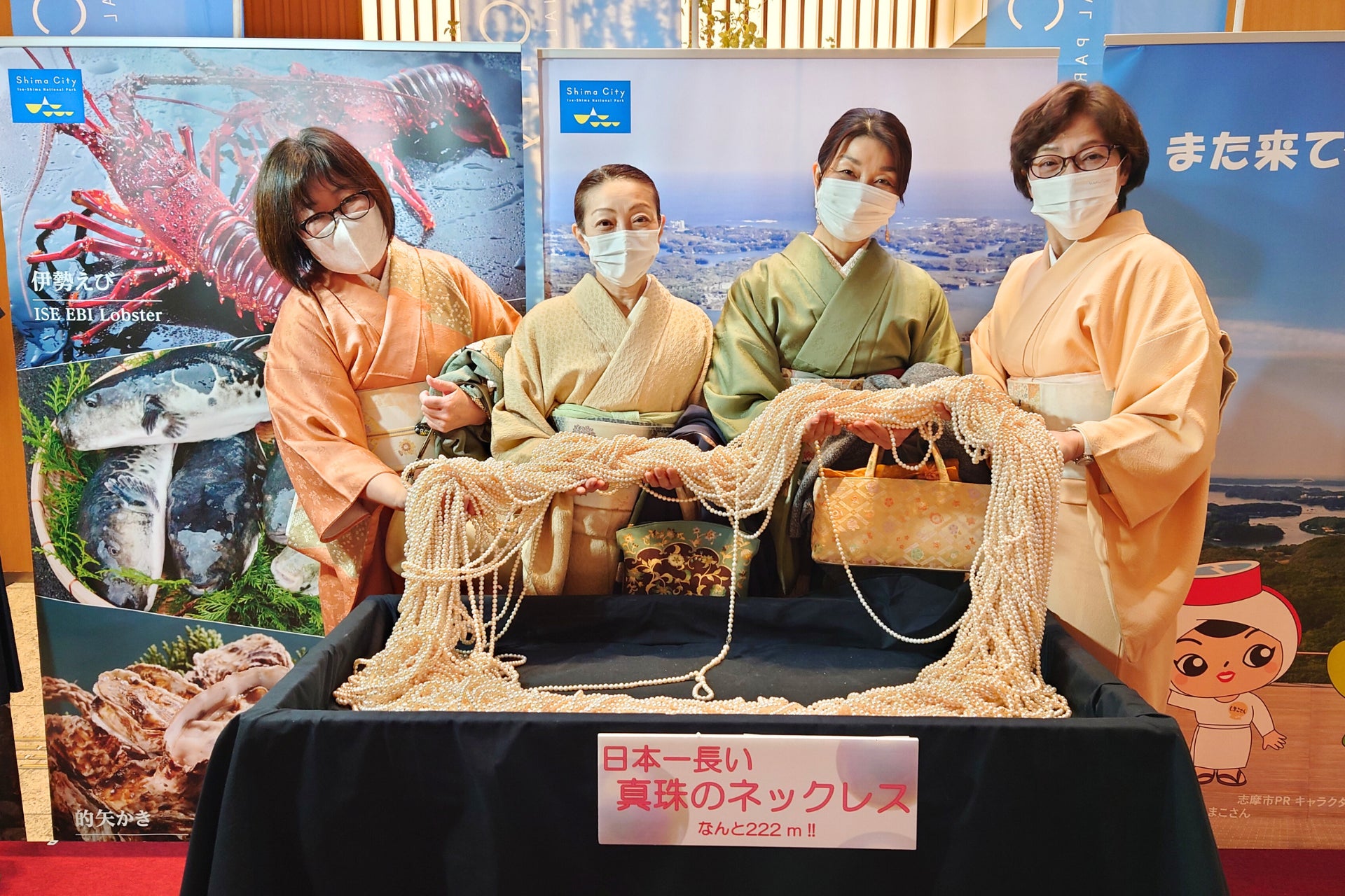 当日は、2010年にギネス記録に認定された「全長222m」の真珠のネックレスも展示いたします。27750個もの真珠が使用され、製作期間は約3ヶ月、2500人以上の志摩市民や観光客によって作られた精巧な宝飾品となっています。