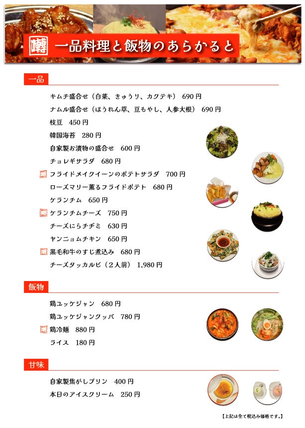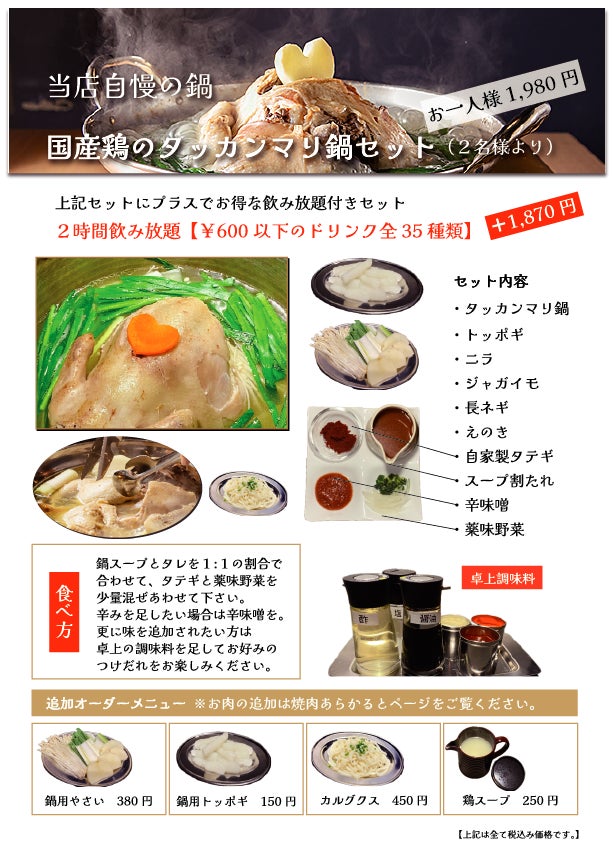 旧店舗より好評を頂いていたタッカンマリ鍋やケランチムなどの韓国料理メニューへ新たにチーズタッカルビも追加しました。