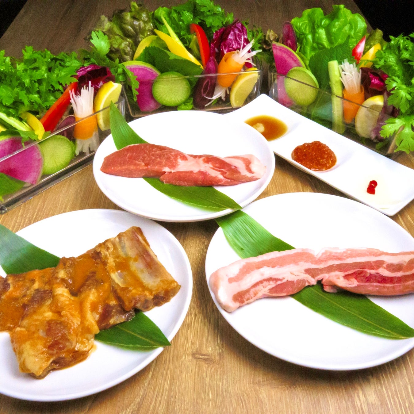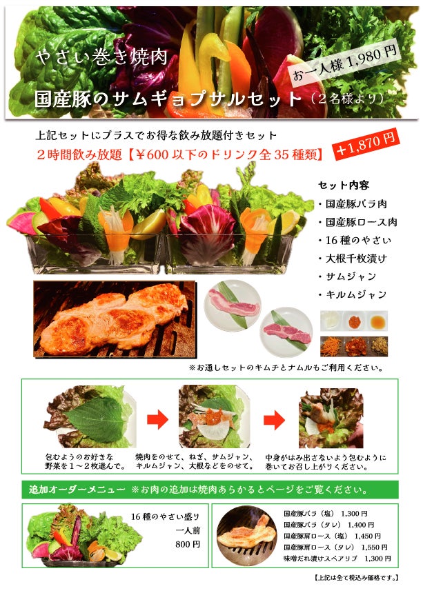 東池袋マルビル 4Fに位置する同店は、新たに取扱い食材を豊富にし素材の拘りも強めました。野菜で巻く焼肉として、国産豚肉を使用したサムギョプサルと大山鶏のとり焼肉。