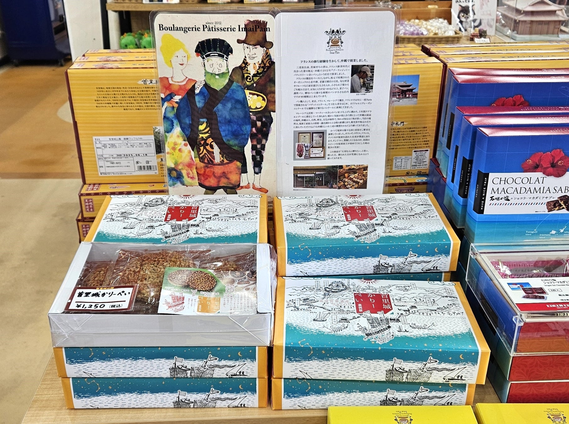 「首里城 嘉例餅」は、沖縄のカレー味の塩せんべいに、フランス菓子フロランタンをヒントにキャラメリゼしたピーナッツをトッピングした新感覚の菓子です。沖縄の言葉「嘉例(かりー)」と英語の「Curry(カレー)」を掛け合わせたネーミングで、2017年度の那覇市長賞優秀賞を受賞しています。パッケージには、久高島在住の画家・山崎紀和氏が描く、貿易で賑わう那覇の街のイラストを採用しました。