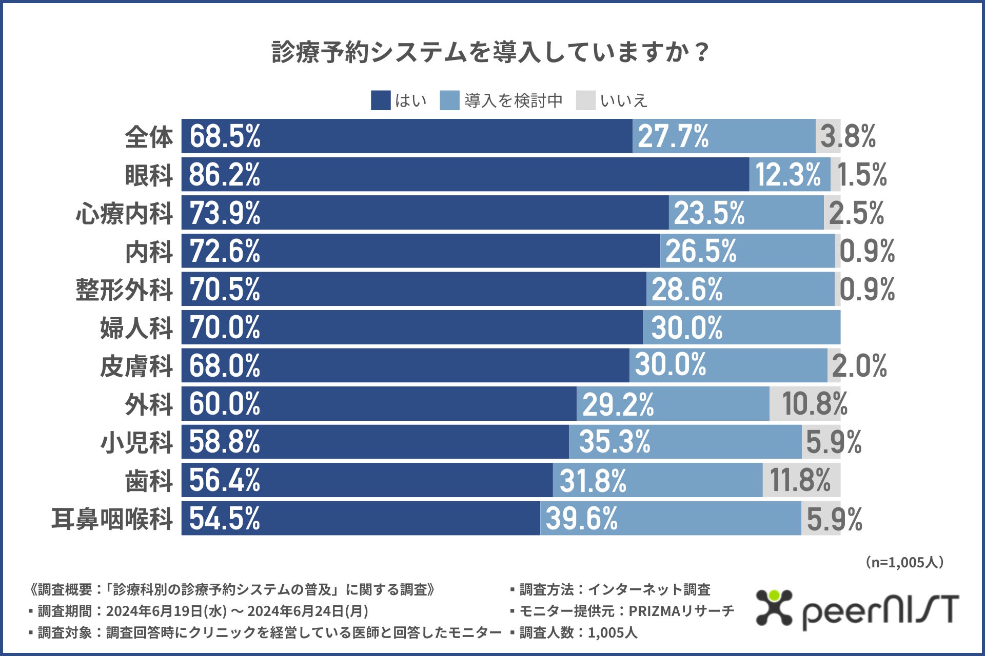 そこで今回、診療予約システム『QuiQ』(https://www.peernist.co.jp/products/quiq/)を運営する株式会社peerNISTは、クリニックを経営している医師を対象に、「診療科別の診療予約システムの普及」に関する調査を実施しました。