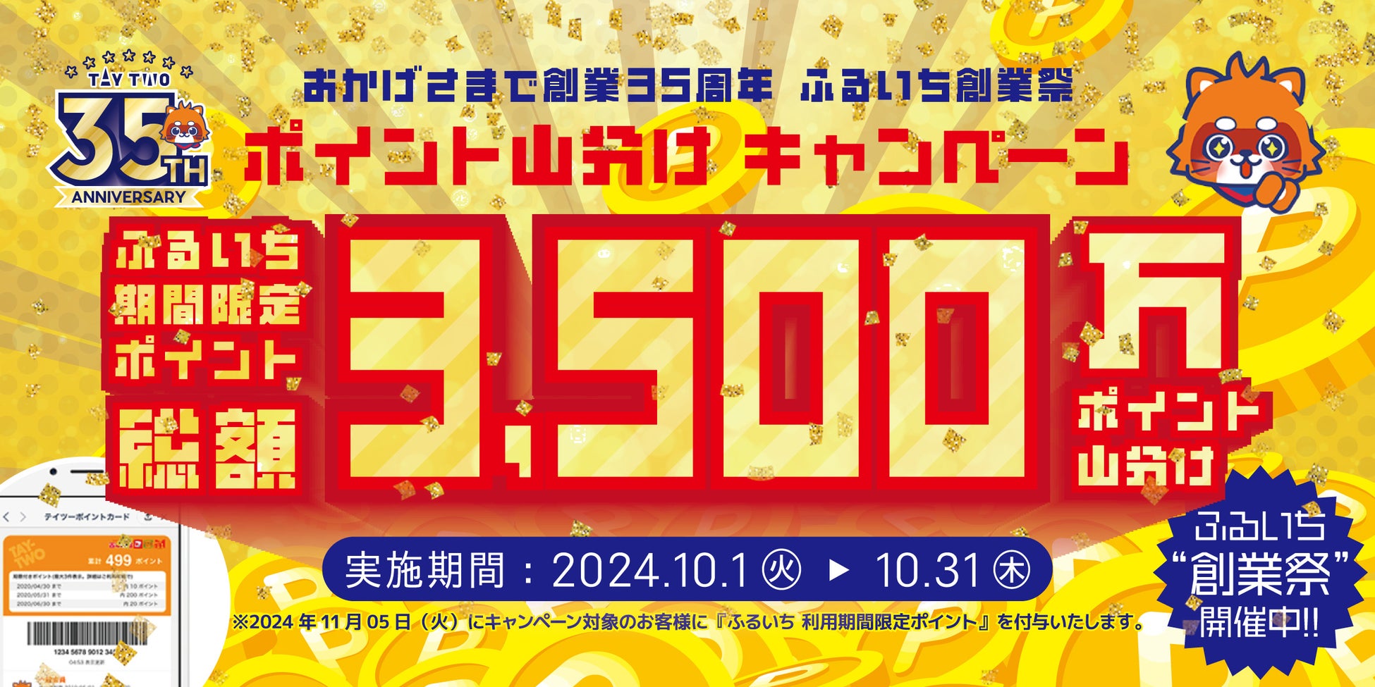 「リユースで地域と世界をつなぐ」をグループビジョンとして、全国に「古本市場」「ふるいち」「トレカパーク」 などを展開する株式会社テイツー(本社︓岡⼭県岡⼭市、代表取締役社長︓藤原 克治、東証スタンダード︓7610、https://www.tay2.co.jp/)は、2024年10月で創業35周年を迎えます。